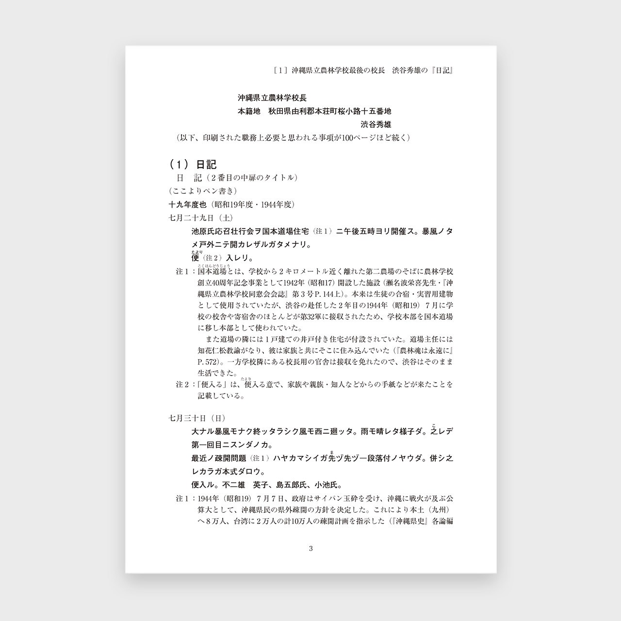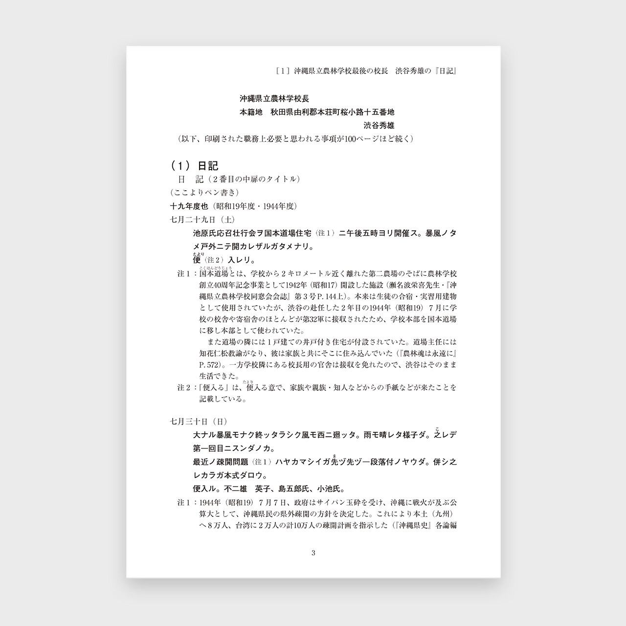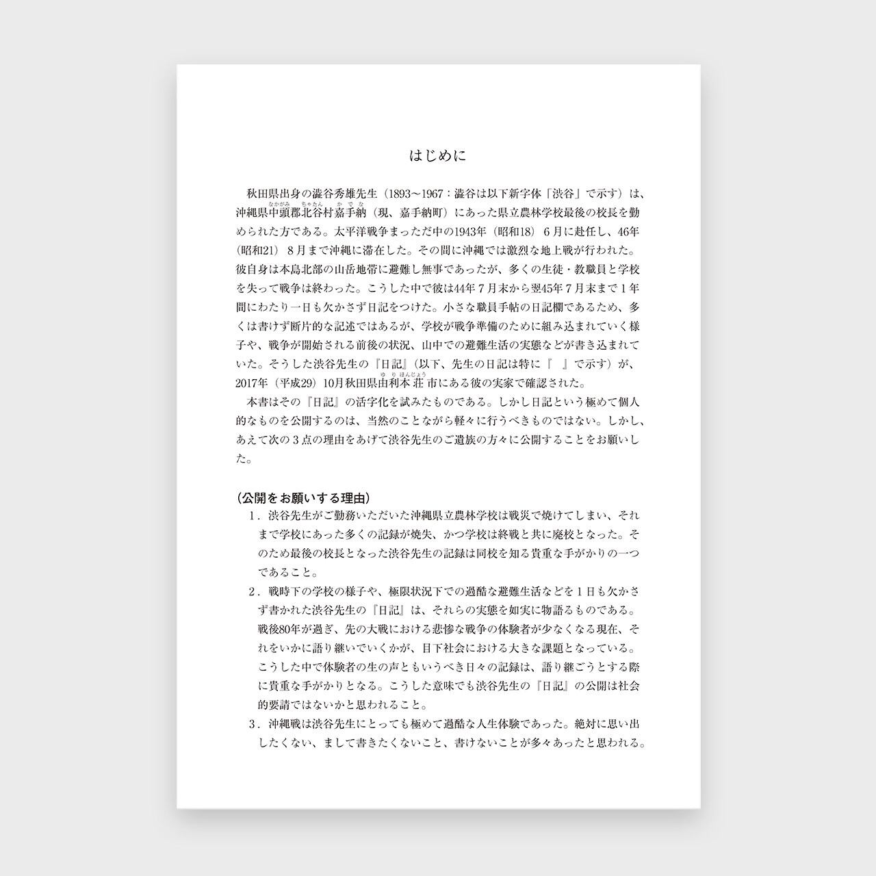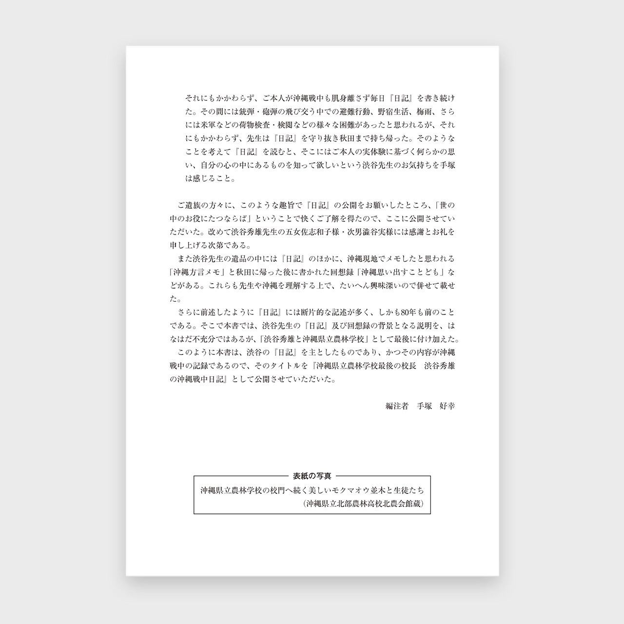 第二次世界大戦末期に、旧沖縄県立農林学校の校長であった渋谷秀雄先生が書き残した日記と方言メモ、エッセイの原稿をご遺族の了解のもとに活字化したものです。