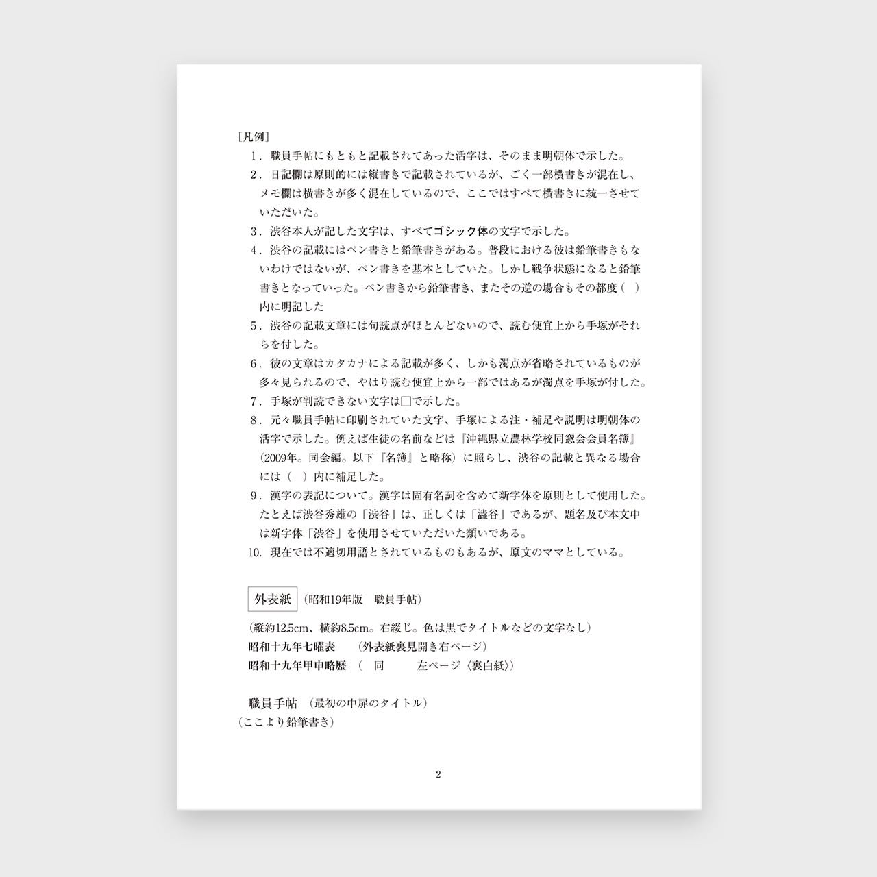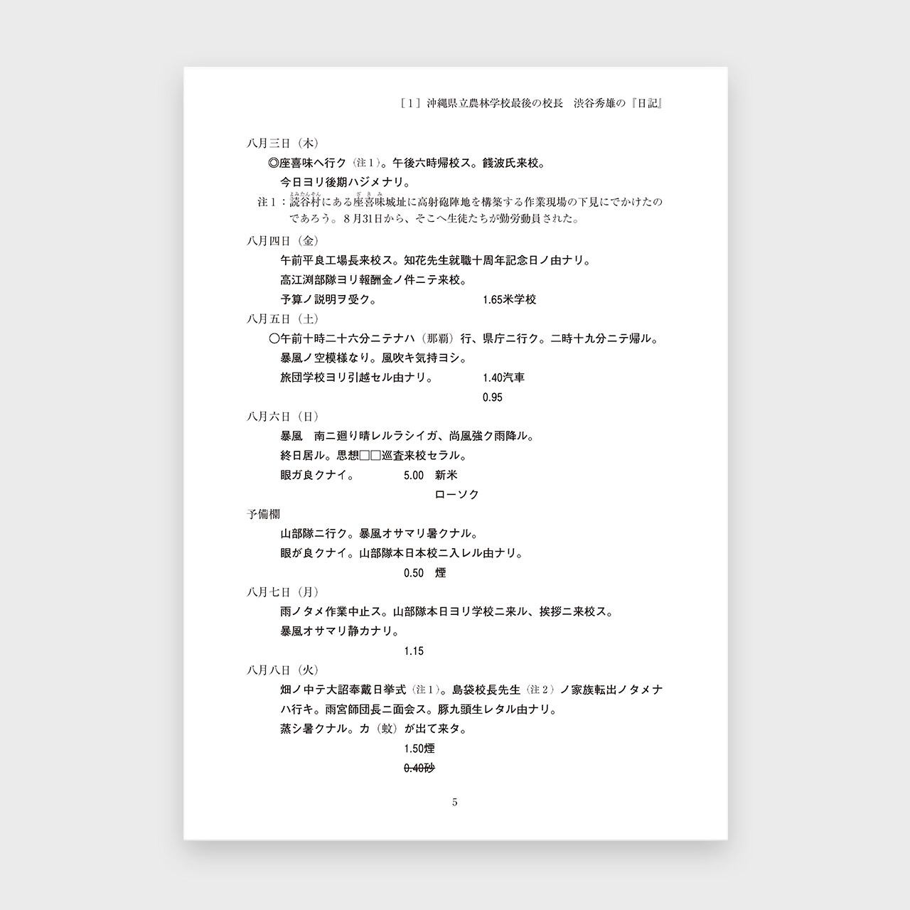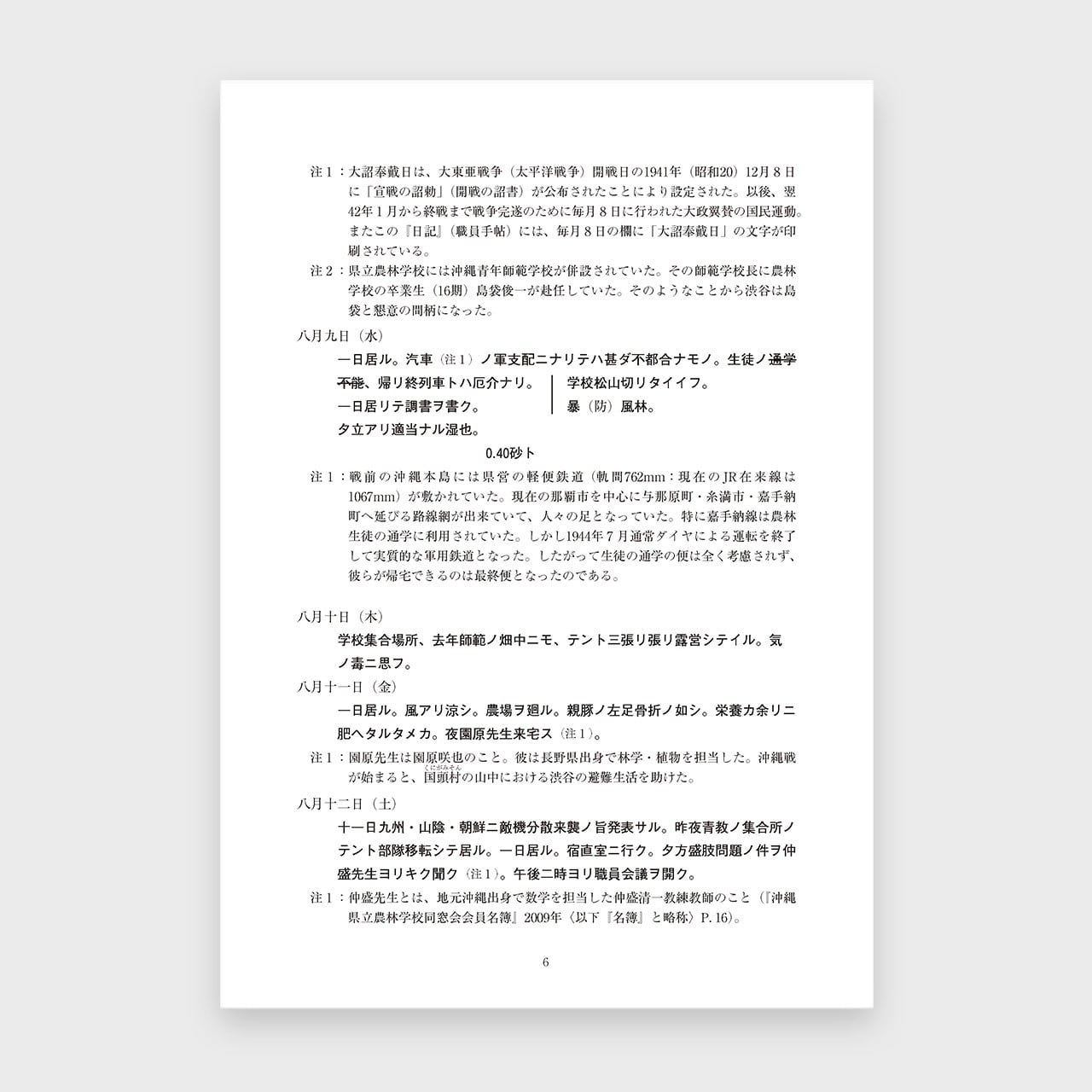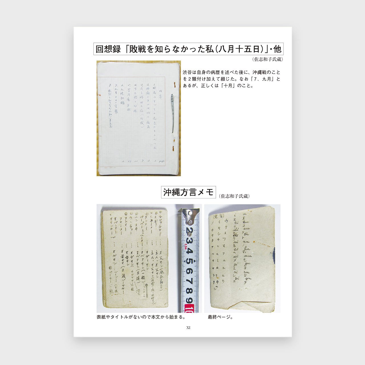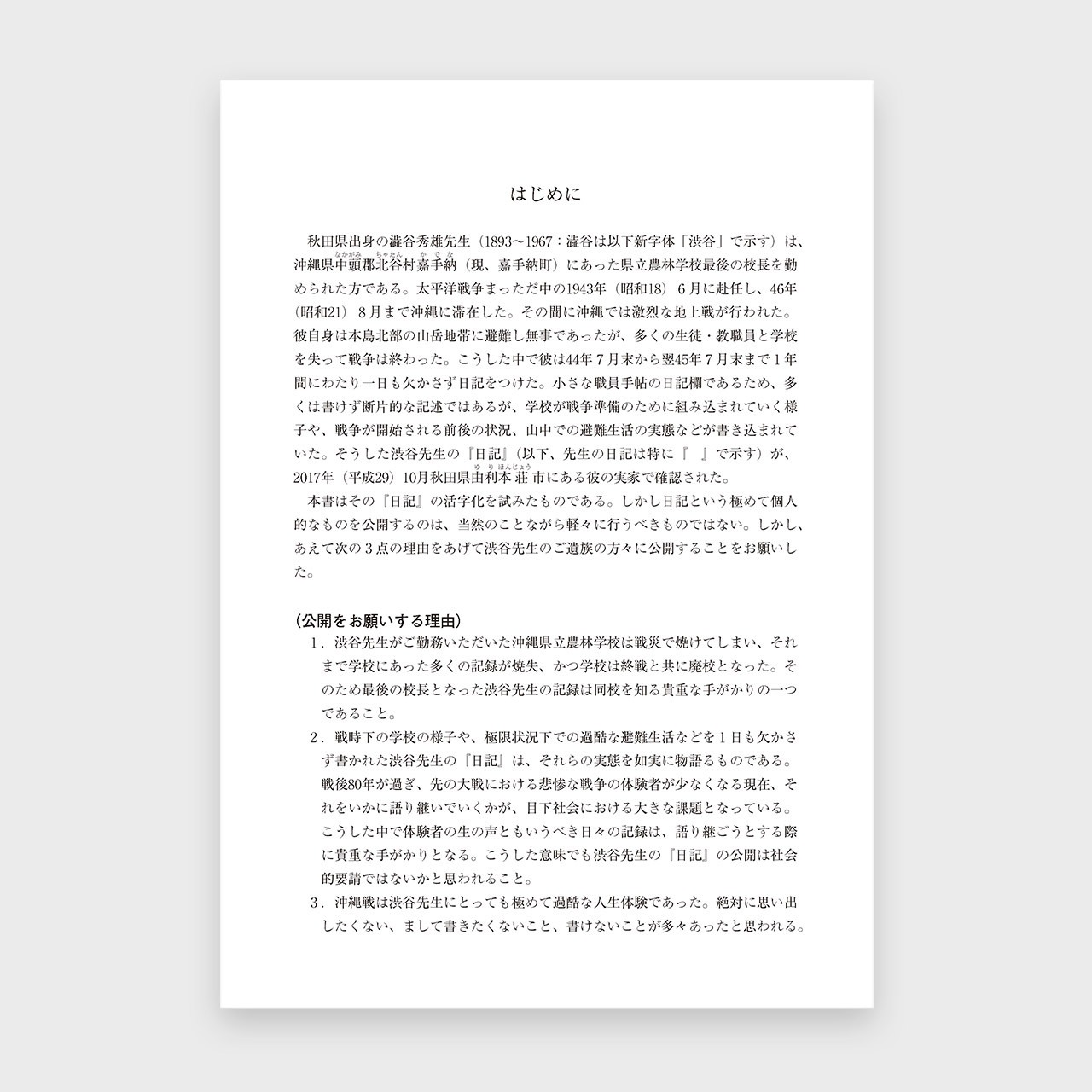 第二次世界大戦末期に、旧沖縄県立農林学校の校長であった渋谷秀雄先生が書き残した日記と方言メモ、エッセイの原稿をご遺族の了解のもとに活字化したものです。